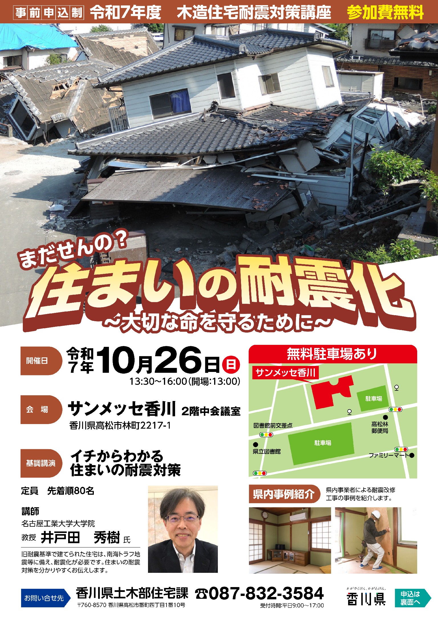 10月26日(日)に木造住宅耐震対策講座「まだせんの?住まいの耐震化~大切な命を守るために~」を開催します。