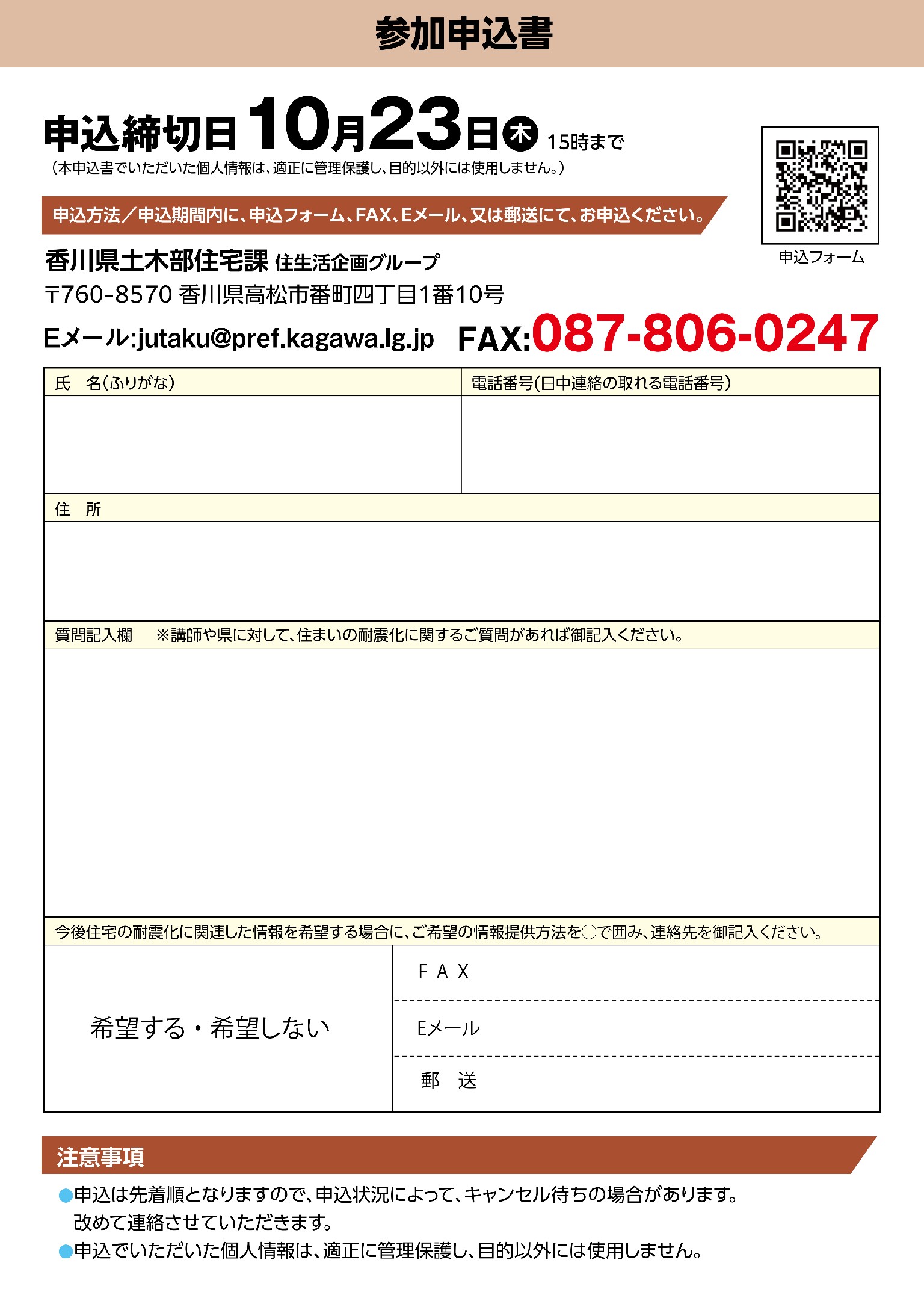 ・申込は先着順となります。申込状況によってはご希望に添えない場合があります。その場合、改めてご連絡させていただきます。 ・申込でいただいた個人情報は、適正に管理保護し、目的以外には使用しません。 |